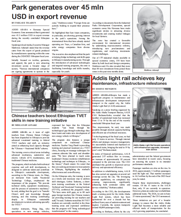 此前,为响应河南省教育厅职业教育国际化号召,我校选派安仕琪老师赴埃塞俄比亚开展数控加工技术培训,项目成效突出。培训活动先后收到埃塞俄比亚联邦技术职业培训学院、Belayb Moters PLC公司、埃塞俄比亚劳动技能部等多方发来的感谢信,也吸引了埃塞俄比亚三家主流媒体对成果进行专题报道,提升了我校职业教育的国际竞争力与影响力。