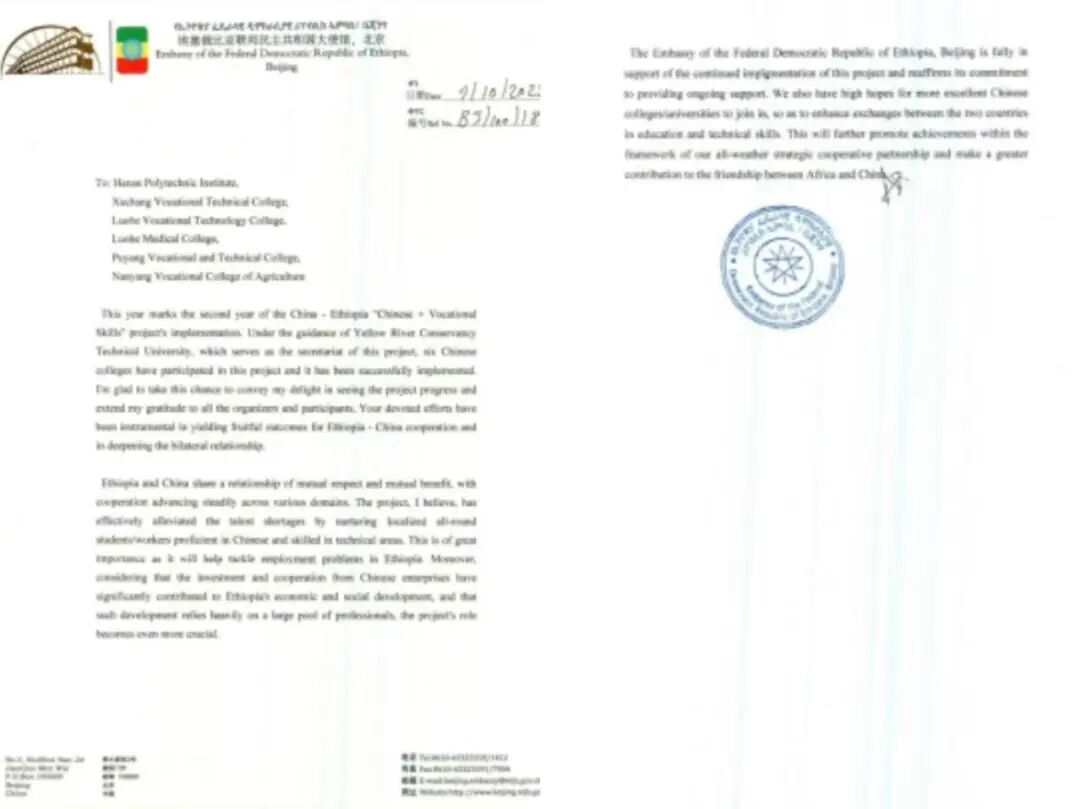 近日,漯河职业技术学院收到了来自埃塞俄比亚联邦民主共和国驻华大使馆发来的感谢信,使馆对我校在“中文+职业技能”项目中发挥的重要作用以及取得的成果给予高度评价,这是我校职业教育国际化工作获得国际认可的重要体现,也是我校落实“一带一路”倡议下教育互联互通的生动实践。