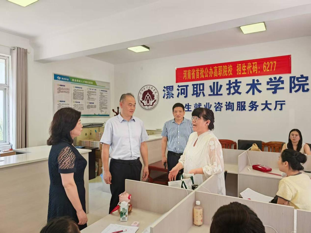 7月3日,漯河职业技术学院院长薛存心深入招生工作一线,就2025年普通高等学校招生报名宣传工作开展调研指导,亲切慰问坚守在一线的工作人员。副院长程传蕊及招生就业处负责同志陪同。