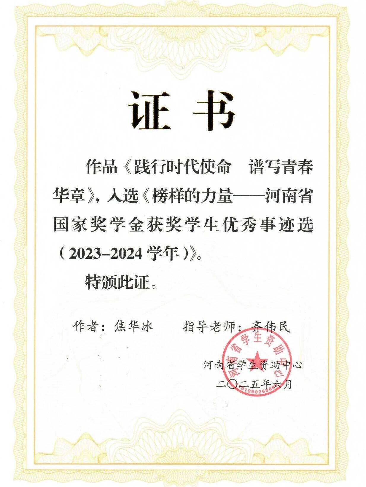 焦华冰同学曾获得国家奖学金、国家励志奖学金、2023年度中国大学生自强之星奖学金、河南省社会应急救援队伍技能实训竞赛第三名,荣获河南省“三好学生”、河南蓝天救援队先锋队员、漯河红十字优秀红十字志愿者等荣誉。焦华冰用行动践行担当,在知行合一、德技并修的校训熏陶中勇毅前行,用勇敢和担当诠释责任,以行动传递温暖。